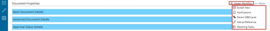 - Document properties: Basic and Advanced properties, Area Details and Custom Details can be assigned to the document here.