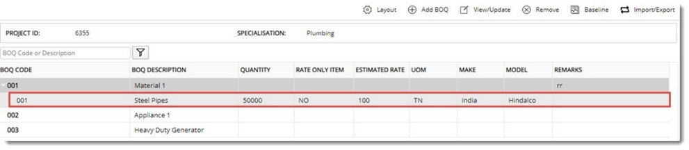 BOQ leaf level items can be created and unit rates and quantities can be specified against the Item.