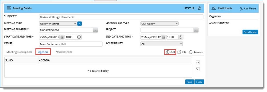 On saving the agenda, a serial number is generated automatically for the added agenda. If there are multiple agendas, serial number will be generated based on the sequence in which the agenda is created.