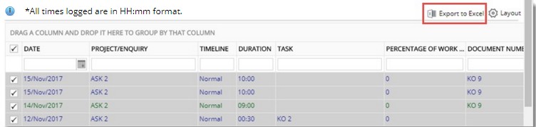 Time sheet entries sent for approval can be exported to an MS Excel file.