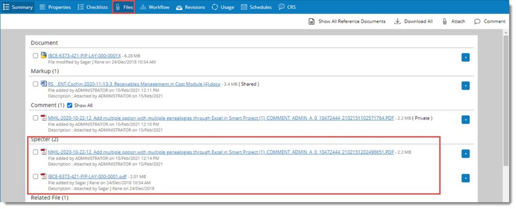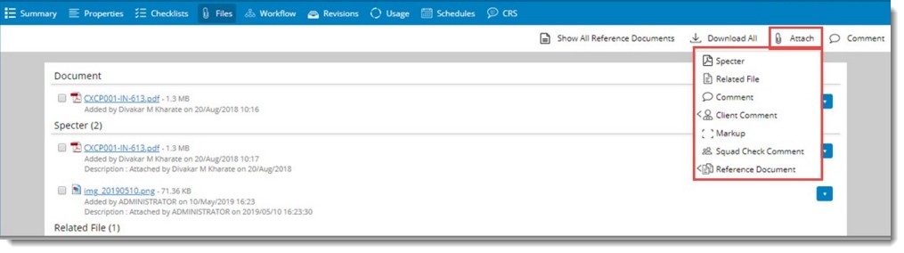 You can add attachments, specter files, comments or markups to existing and also to previous revisions of a document. This facility enables the user to identify the Comments/Attachments of a particular revision at a later point of time.
