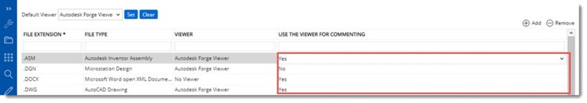 Facility to comment from the viewer can be configured from the Viewer Settings window. In the Viewer Settings window, there is a column USE THE VIEWER FOR COMMENTING. Values YES or NO can be selected from a drop-down list. By default, this value will be NO.