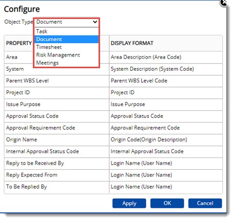 Here you can configure the display format for properties like Area, System in Import/Export templates. Display format can be configure for selected properties of tasks, documents, risk management, meetings and time sheet.