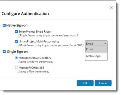 SmartProject supports both Native Sign On and Single Sign On. In the case of Native sign on, option to authenticate using single factor and multi factor is available. A detail description of this is available in the accompanying table.