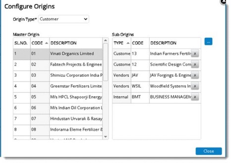 Sub-origins available against the selected origin, in the master origin list is displayed here. To add a sub origin to the selected Master Origin