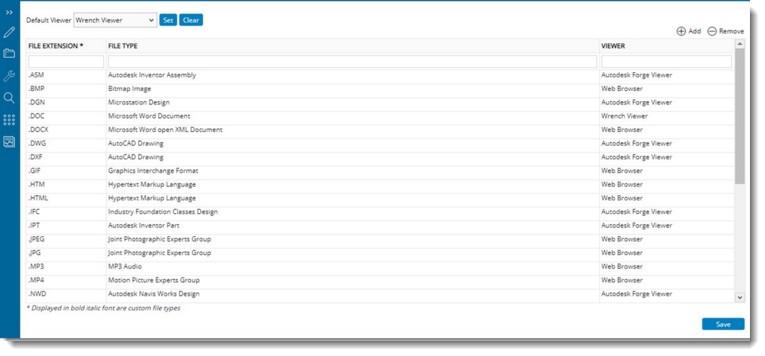 Default viewer is used to simplify the viewer configuration. For Example: There are multi-format file viewers commercially available in the market, which can be integrated with Wrench such as ‘Autodesk Forge’ and ‘Rasterex’. Customers may purchase such viewers and set it as ‘Default’. Once set as default, the individual file types can be assigned with ‘Default Viewer’ as the viewer. In case the user later decides to change the default viewer, the individual association of viewer with file type need not be updated, instead the default viewer is changed. A set of viewers will be available in the drop-down list.