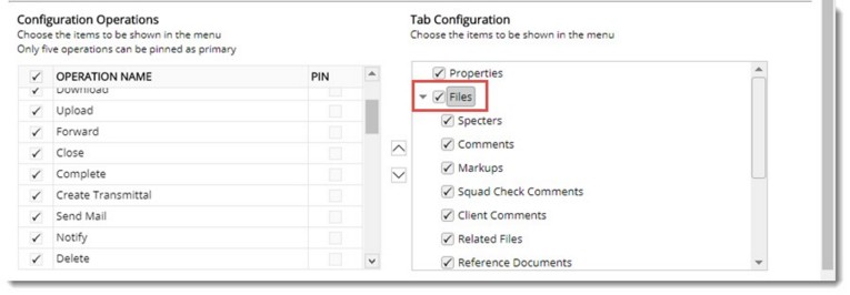 - In the Tab Configuration window click Files. Different attachment types are displayed.
