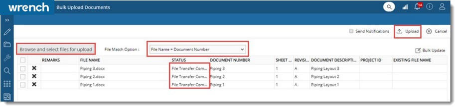 If the File Name (name of the file in the local drive) and the existing Document file name matches, in the Bulk Upload window status column, the status is displayed as Match found.