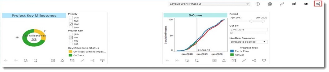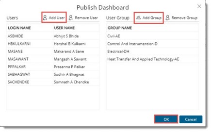 Dashboard created by a user can be published to the user groups and individual users. Once published dashboard will be available for all users in the user group.