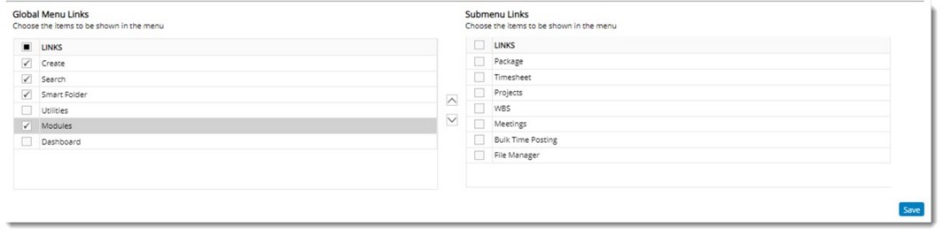 Items that you want to appear in the global menu of a user can be defined here. This helps in configuring the global menu according to the requirement of the user. Items that are not used by a user can be removed from the global menu so that only menu items that are necessary for a user will be displayed.