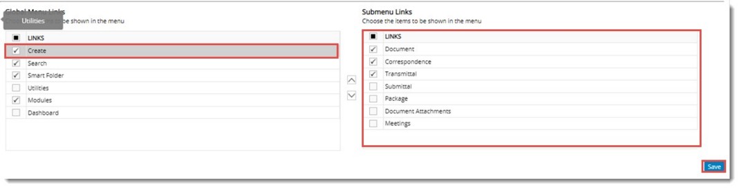 Submenu refers to the drop-down menu that is displayed when an item in the global menu is clicked. Items that you want to appear in the submenu can be defined here.