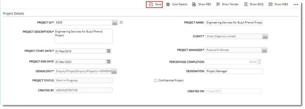 Once a project is created. Project Properties are displayed here. You can edit project properties from this window. After editing the properties click Save to update changes.