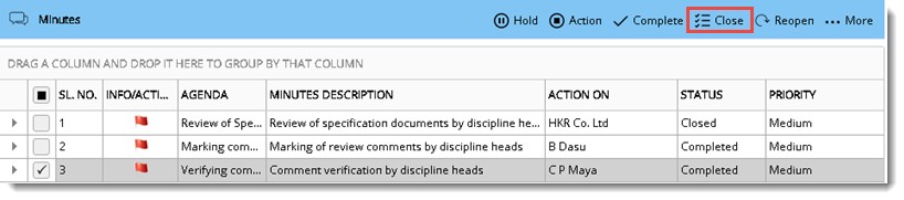 Minute items closed successfully message is displayed.