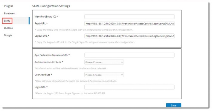Plug-in configuration for Live commenting, MS Outlook integration with WRENCH meetings, Google Maps and Single Sign On using Office 365 can be carried out here.