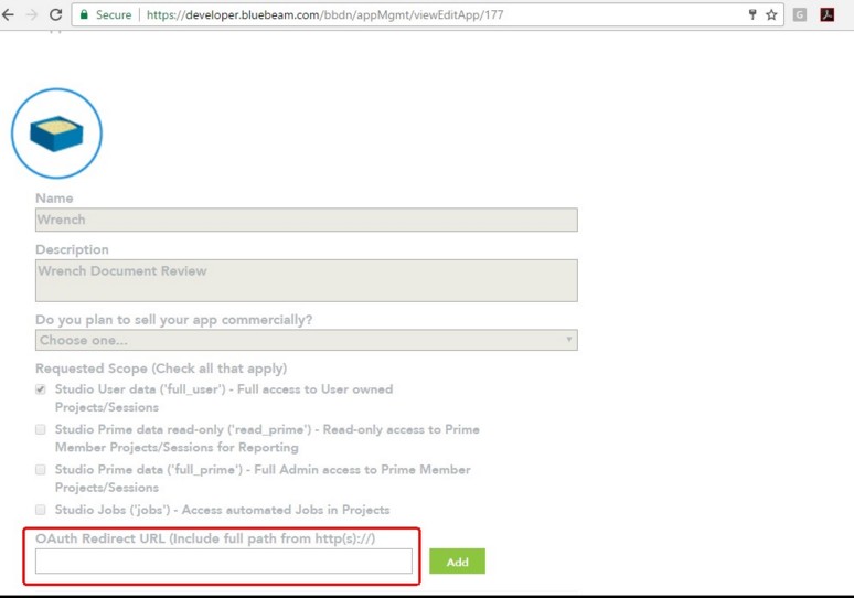 Bluebeam Server URL: Cloud Server URL for connection to Bluebeam. Value for this property will be hardcoded.