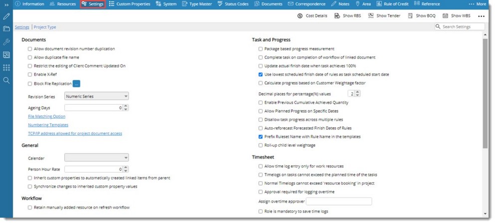 Here basic document and Work Breakdown Structure settings can be defined. The settings that can be defined in this pane are described in the following section.