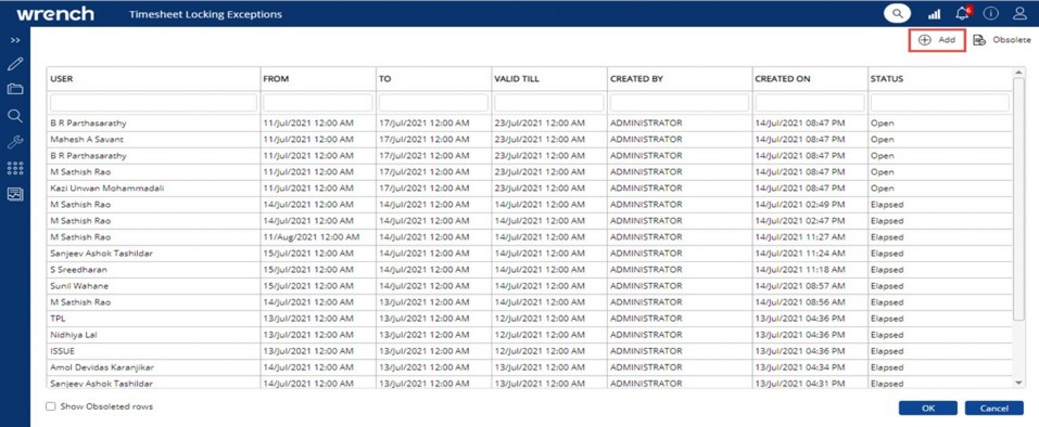 Locking interval can be selected from a drop-down list. Options available are Day of each Week and Day of each Month. If the option Day of each Week is selected, Friday is displayed by default as interval. Days of the week are available in the drop-down list. If the option Day of each Month is selected, End of the Month is displayed by default as interval. Dates of the month are available for selection in the drop-down list. If this setting is enabled, user will not be able to submit time logs if any of the selected time log date is before the locking date of the project. Submission of full-Time logs for the week is restricted with a warning message. Defining exceptions in Project Timesheet Locking Though the time sheet is locked on Day of each Week or Day of each Month basis, in some cases this lock must be lifted for some users. To handle this in the Project Setting window, option to define exceptions is available. If an exception created is no longer valid or applicable, user may obsolete the created exceptions. |