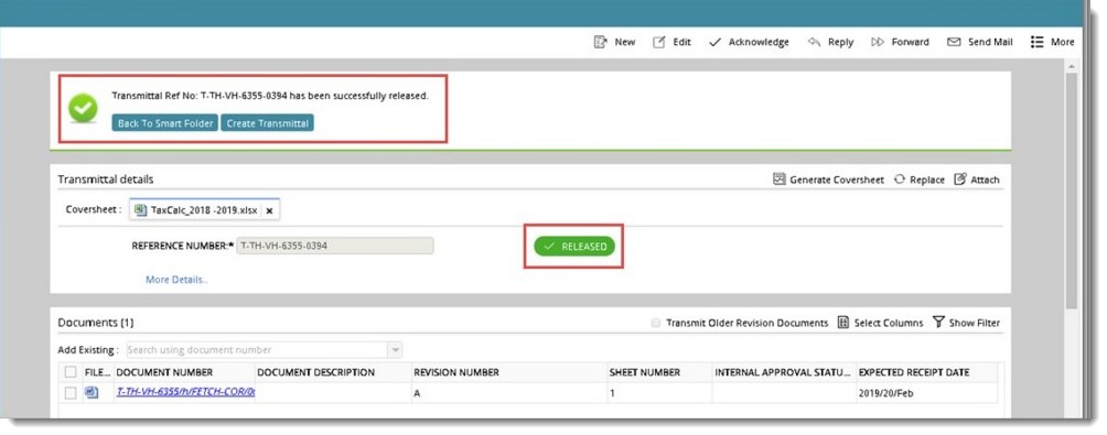 In the window a legend indicating the status of the transmittal as RELEASED is displayed. Options to go back to Smart Folder or create another transmittal is available.
