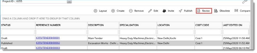 Published tenders may be revised when any major changes are to be made. Only users with ‘Revise’ permission will be able to do the operation. Tenders when in ‘Published, ‘Republished’, ‘Closed’, ‘Bid Evaluation’, ‘Recommended’ statuses can be revised. Attempt to revise tenders in other statuses is aborted with an alert message.