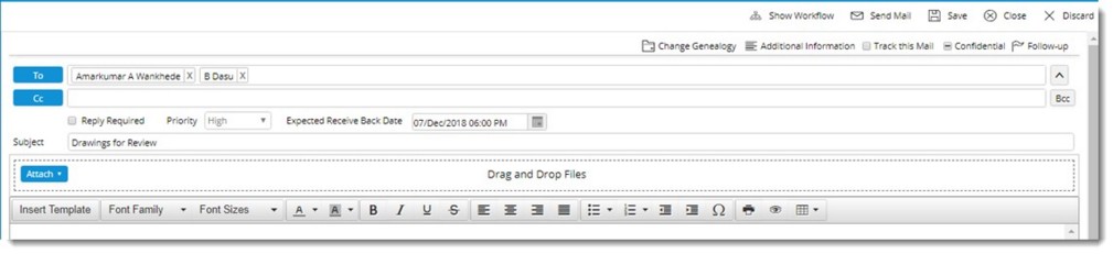 After assigning the recipients, entering correspondence properties, adding attachments and entering subject and content for the correspondence, the mail is sent to the assigned recipients. Also a message that you are composing can be saved as a draft and finished later.