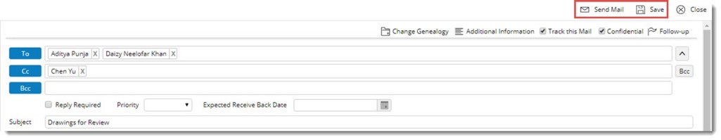 NOTE: In case there is a workflow added to the mail and the workflow is started instead of Send Mail button Send button is displayed.