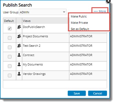A saved search can be published to a user group or user. By publishing saved search its status changes from Private to Public. Only Adminstrator or Admin user can carry out this operation.