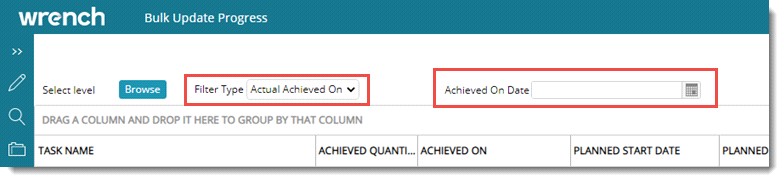 In the window if the Filter Type selected is Actual Achieved On, a date picker to choose the Achieved On Date is displayed.