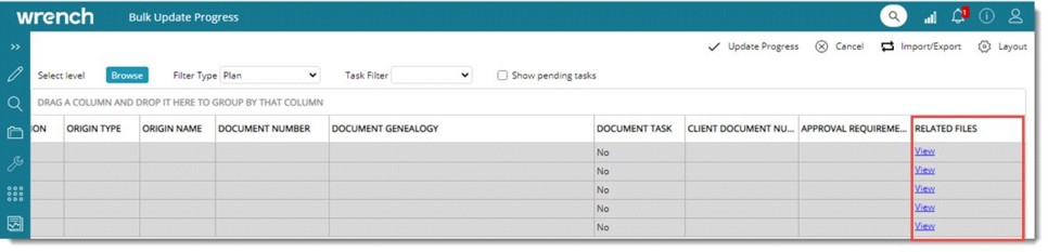 When updating the daily progress against a task in the Bulk Update window, it may be required to upload files or images against each update. For this a new column RELATED FILES is available in the window.