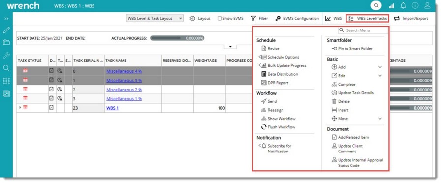 WBS is a collection of tasks. Different options are available for managing tasks in WBS. These options are housed in the menu that is displayed when the mouse is hovered above the Tasks button.