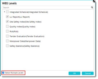- WBS Levels window is displayed. WBS Levels are displayed here. If the checkbox next to Select Multiple Levels is selected, option to select multiple WBS Levels is enabled.Select the required levels and click OK to complete selection.