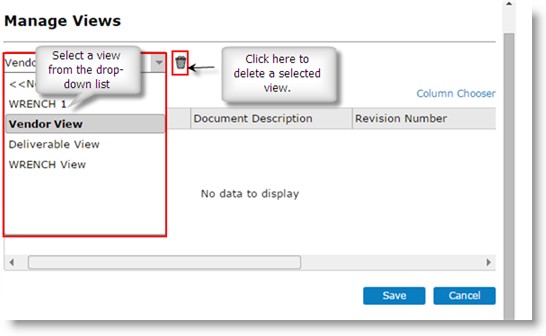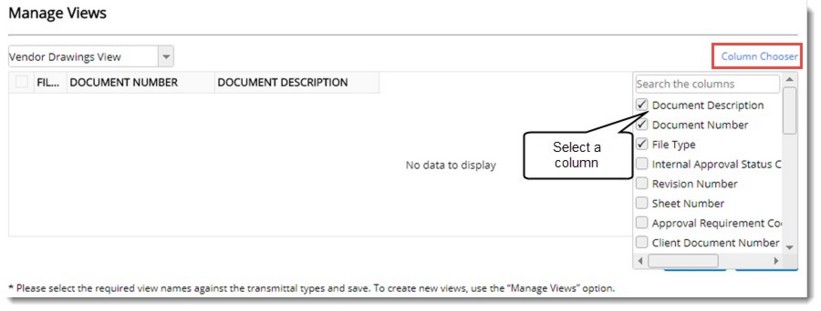 Here you can define views for a transmittal type. Different columns that have to be displayed in a view can be selected and the view is saved under a unique name. You can also delete and replace an existing view.