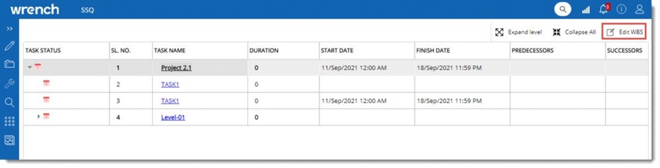 After all the tasks in the WBS is completed, the WBS can be completed using this option. Once the WBS is completed, no new tasks can be added to the WBS nor can the task schedules be edited. If there are any incomplete tasks in the WBS, a warming message is displayed.