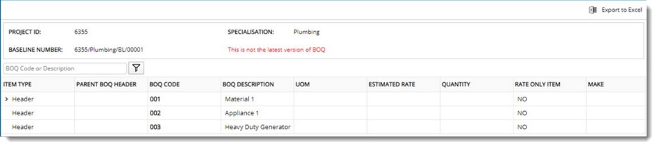 For old baselines, an information text, This is not the latest Revision of BOQ is displayed in red font.