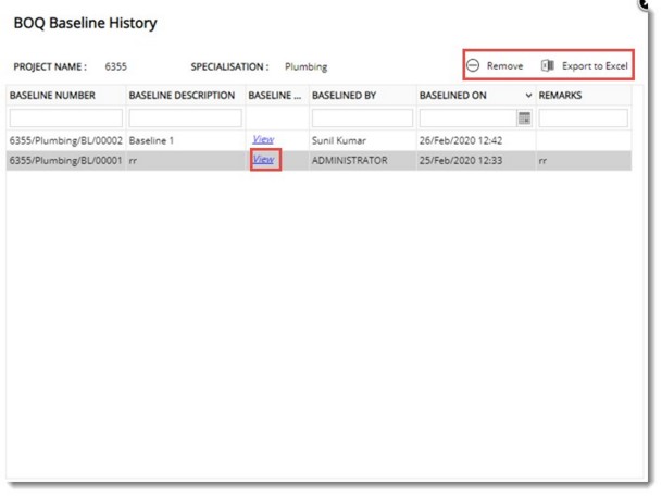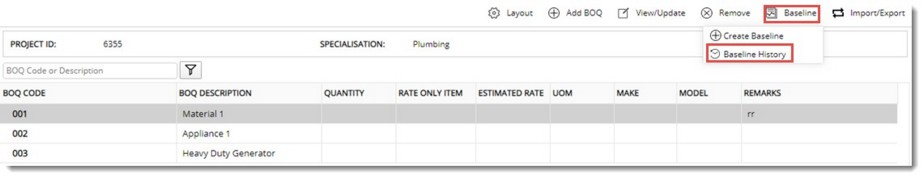 BOQ Baseline History window is displayed. Baselines will be displayed in the window with latest on the top.