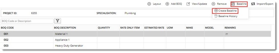Baseline is done to create a backup of the BOQ before making a change or revision.
