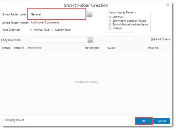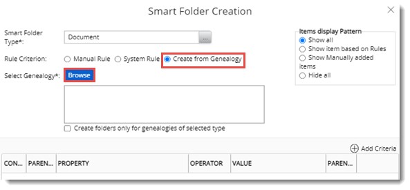 NOTE: When a smart folder is created using the Create from Genealogy option, the smart folder hierarchy is created as per the selected document genealogy hierarchy. If leaf level smart folder is selected, then in the Items Display Patter radio button next to Show All is selected. For all the parent level smart folder the option selected will be “Show manually added items.”
