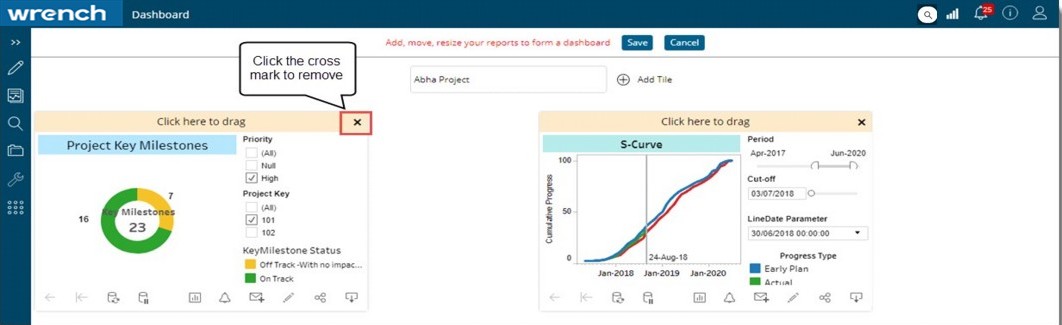 New reports can be added, to a dashboard, existing one can be removed, and dashboards can be re-sized or moved.