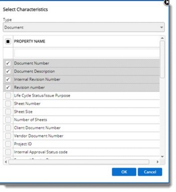 Select Characteristics window is displayed. Here list of custom properties which are linked to the custom classes are listed.