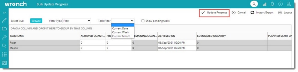 In some scenarios, when user update the progress of tasks daily, the work in progress tasks is the same as the tasks which are updated on the previous day. Hence in the Bulk Update Progress window, for quantity-based tasks, facility to filter the tasks with ‘Actuals’ updated on previous day or a specific date is provided.