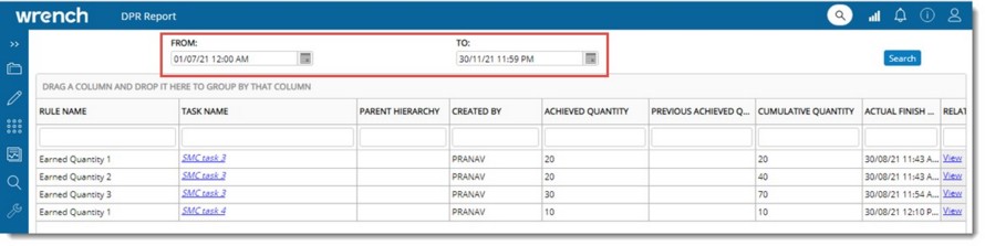 Progress details updated on a specific date or a date range can be viewed by generating a DPR report.