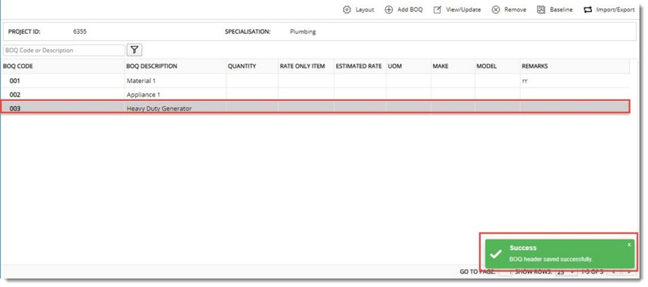 - After entering the values click OK. BOQ header created successfully message is displayed. A BOQ Header or Item is created and is displayed in the grid.
