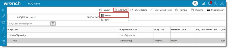 Figure: Adding BOQ Header