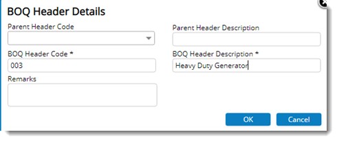 - BOQ Header Code: Enter code for the new item. This field is mandatory.