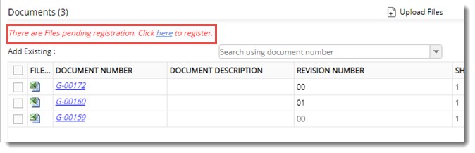 Once the upload is complete, the transmittal from which the upload request was generated will display a note stating that files are pending for registration.
