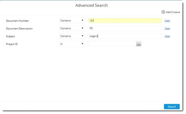 - In the Advanced Search window enter values for different search criteria and click Search.