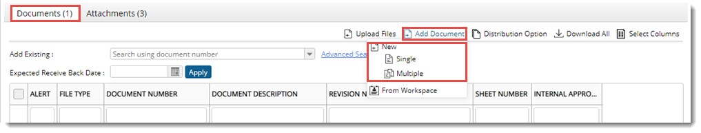 Documents that have to be issued for different purposes can be added to a transmittal. You can either add a new document or add a document in your workspace which is in the transmittal stage.