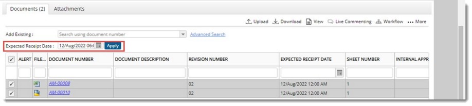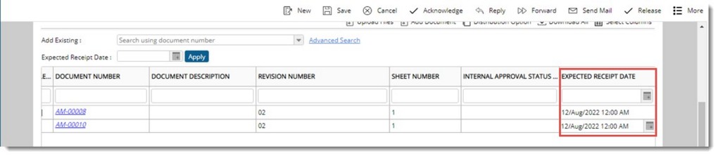 Receive back dates can be updated for the documents that are sent with the transmittal. In the case of general transmittal Expected Receipt Date has to be updated and in the case of release transmittal Expected Receive Back Date can be updated from the transmittal grid.