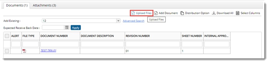 NOTE: Before clicking the Upload Files option, ensure the transmittal is saved. Or else a warning message is displayed. Upload option will be available only for transmittals that are in edit mode and not released.
