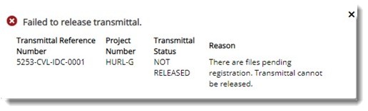 When releasing the transmittal, if there are documents pending for registration the following warning message is displayed.
