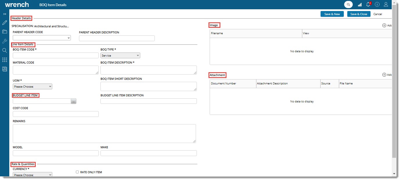 BOQ Item Details window is divided into the following sections.